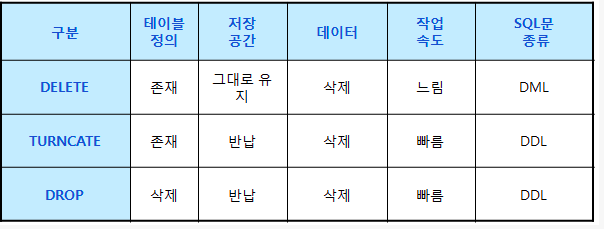 drop은 테이블과 데이터 모든것을 그냥 날려버린다고 생각하면 된다. 물론 날렸기때문에 복구도 불가능하다.처리속도가 빠르다.