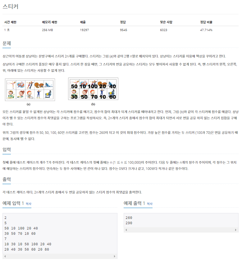 public static void main(String[] args) throws Exception{ BufferedReader br = new BufferedReader(new InputStreamReader(System.in)); BufferedWriter bw = new BufferedWriter(new OutputStreamWriter(System.out)); int n = new Integer(br.readLine()); while(n-->0){ int m = new Integer(br.readLine()); int arr[][] = new int [3][m+1]; for(int i=1;i<3;i++){ StringTokenizer st = new StringTokenizer(br.readLine()); for(int j=1;j<m+1;j++){ arr[i][j] = new Integer(st.nextToken()); } } int dp[][] = new int [3][m+1]; dp[1][1] = arr[1][1]; dp[2][1] = arr[2][1]; for(int j=2;j<m+1;j++){ dp[1][j] = Math.max(dp[2][j-1], dp[2][j-2])+arr[1][j]; //첫번쨰 대각선 짧은 대각선 dp[2][j] = Math.max(dp[1][j-1], dp[1][j-2])+arr[2][j]; //두번째 대각선 긴 대각선 } bw.write(Math.max(dp[1][m], dp[2][m])+"\n"); } bw.close(); }