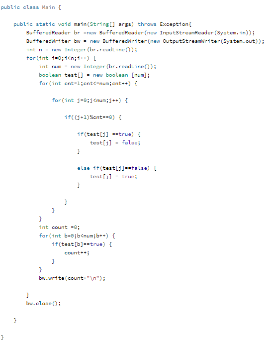 1. n배수별로 if문을 통해서 문을 열고 닫고를 구현했다. 하지만 if문을 통해서 따로 벗어나도록 했고 문제를 풀고 난뒤에 다른 분들의 소스를 참고한 결과 더 좋은 방법이 있었다.